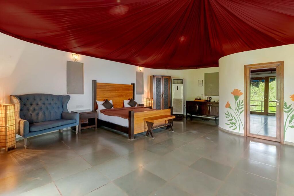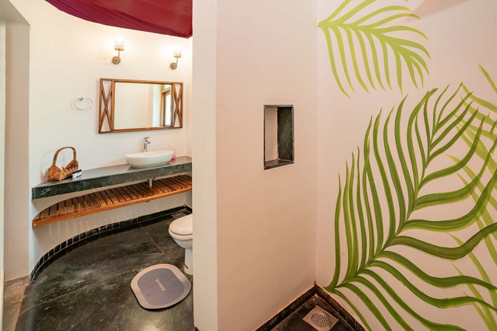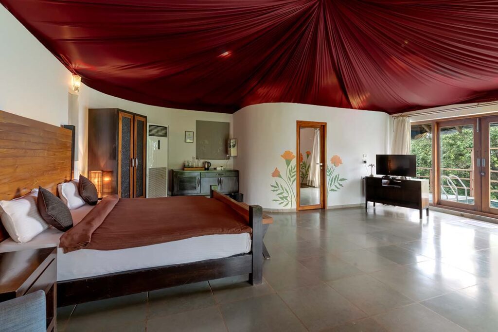 You cannot resist the allure of the Hermitage Marigold, which is the best combination of luxury and functionality. A queen-size bed adorned by a side table welcomes you that also has a convenient charging point on the side. There is also an equally irresistible 2-seater sofa where you could lounge for hours together before you even try to venture out. A mini-fridge helps you store cool refreshments, while a wardrobe safeguards your treasures. Use the lock-in combination safe to keep your valuables. Organised grandeur meets elegance as your every comfort is taken care of comprehensively. Get some leisurely soaks in the bathtub as a companion sits at the wooden stool next to you. The en-suite bathroom has a shower area with a basin and mirror. Your balcony opens up to a small and pretty pool with views of the expansive Arabian Sea as your backdrop.