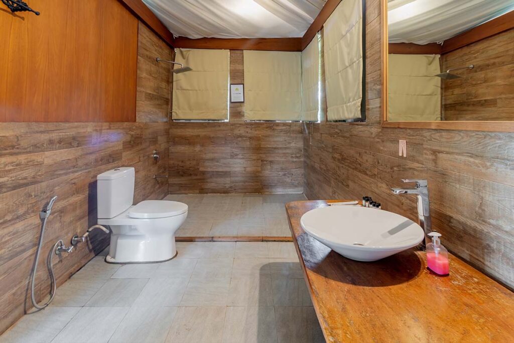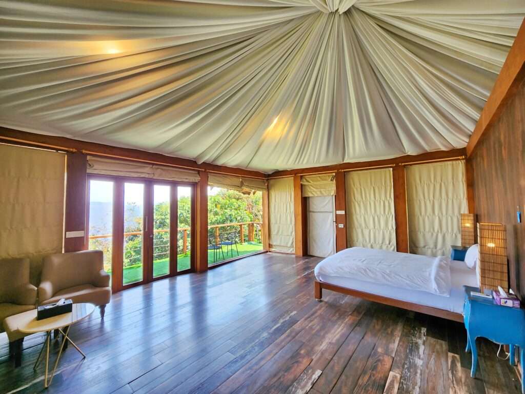 Tree Hopper is a wooden-themed serenity, which is genuinely calming – you can hear the sound of silence just as you enter this luxurious and cosy accommodation. It is canopied by giant trees that act as a covering. A regal king-size bed is surrounded by a curated ensemble, adding to the rustic delight. A large balcony unveils breathtaking side views of the mountains. Sit down with your friends to bask in its beauty. Rest your legs by sinking into the sofa or enjoying entertainment on the TV while perching by the table. Every detail within the accommodation transports you to a realm of sheer luxury.