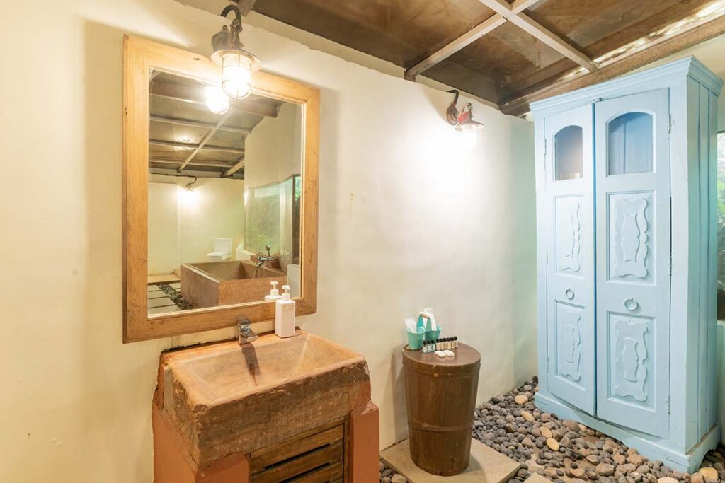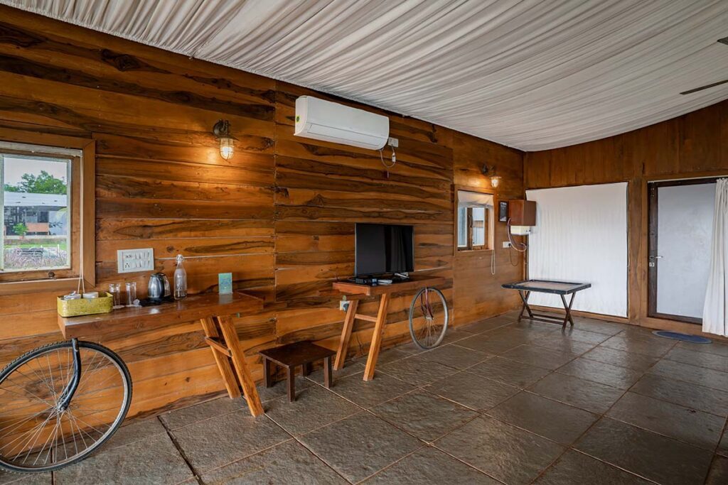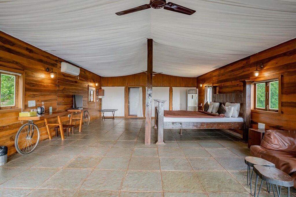 An intricately timbered canopy adorned with petite, sunlit windows, the Woodpecker derives its name due to its all-encompassing wooden charm. A serene tranquillity washes over you as you step into this lovely space accentuated by wooden fans that stir the air gently. This unconventionally simple place is massive and amazingly rustic and tends to embrace you completely. Beyond, you will visualise the infinite rivers and mountain vista framed by a small patio that offers you a passage to an ethereal domain. The room has antiques placed in it and adorns a pool just a few steps as you come out your room for you to take a dip whenever you feel like it. Monsoon voyagers will be entranced by the raindrops collecting and cascading off the green leaves, a mesmerising spectacle that amplifies nature’s allure.